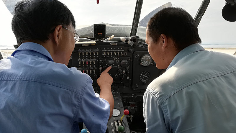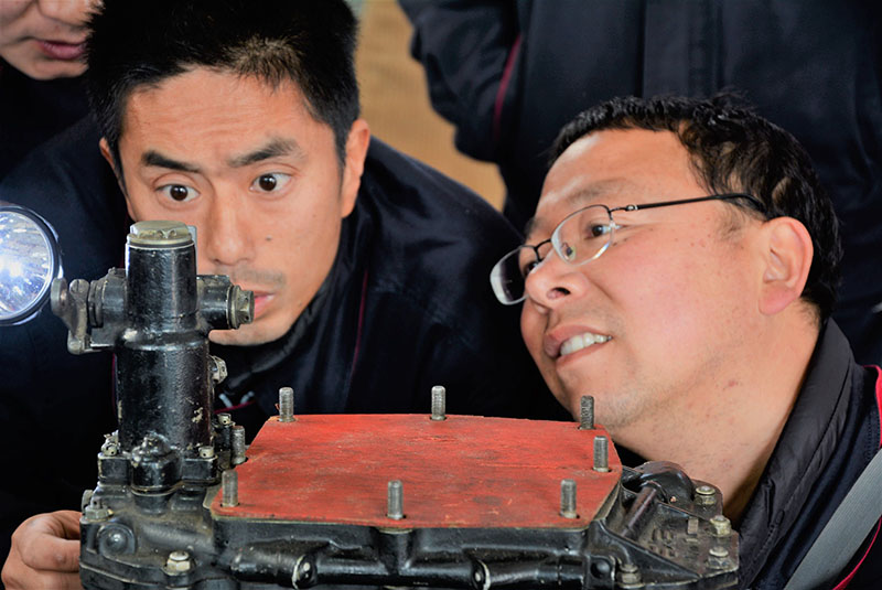 楊必武(圖右一)于2011年從學(xué)校畢業(yè)到荊門通航機(jī)務(wù)工程部從事機(jī)務(wù)維修工作,公司指派了理論基礎(chǔ)扎實(shí)、維修經(jīng)驗(yàn)豐富的機(jī)械師羅暉(圖左一)作為他的師傅。7年時間的培養(yǎng),楊必武目前已考取了維修執(zhí)照,成為機(jī)械維修隊(duì)伍中青年主力擔(dān)當(dāng)。